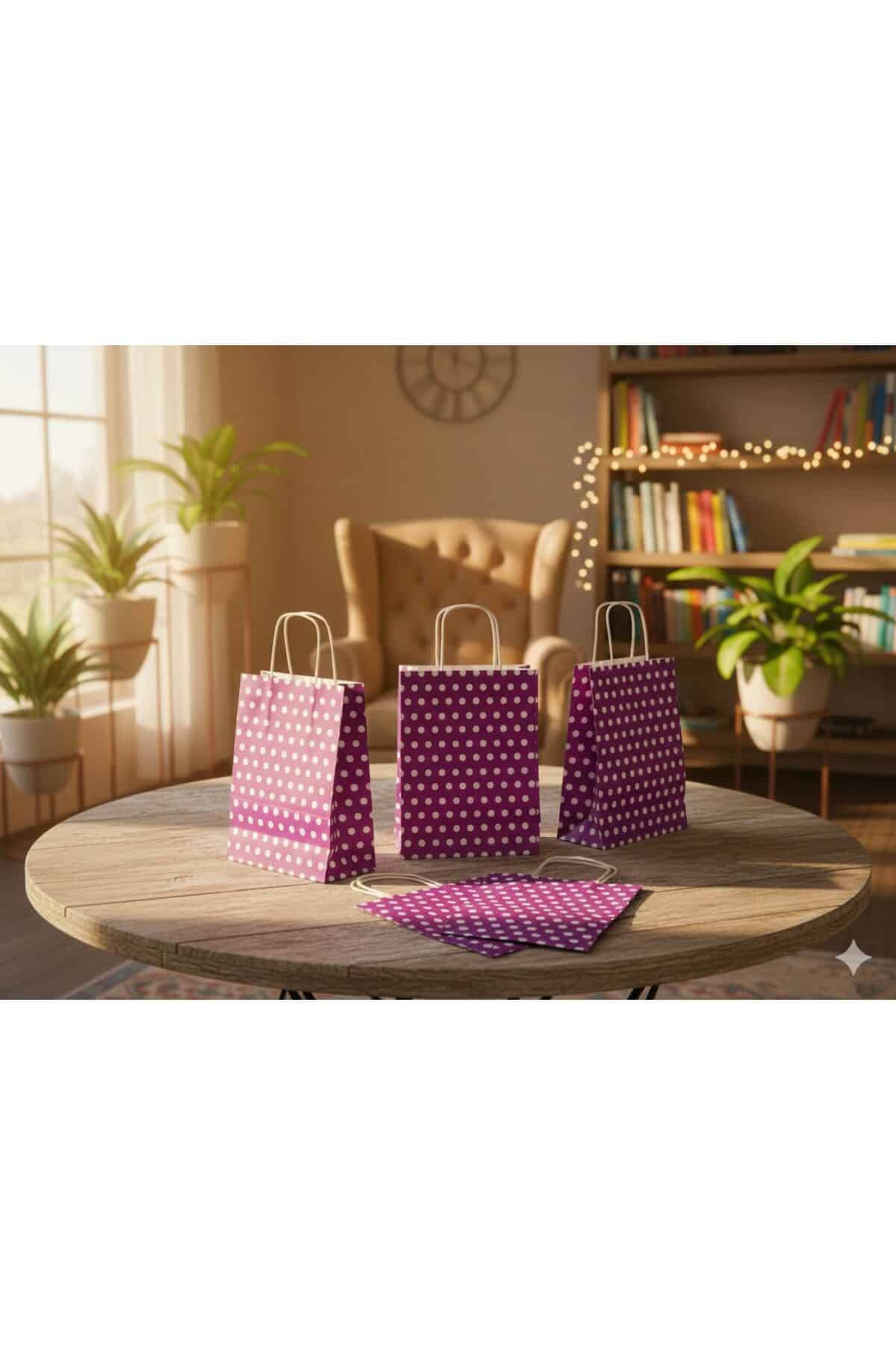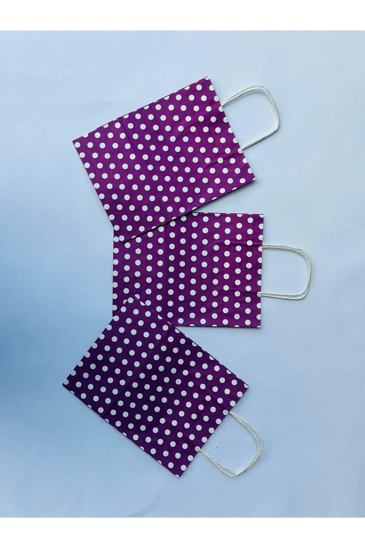 1.Kalite 18x8x24 Cm (3 Adet) Mor Renk Beyaz Benekli Puantiyeli Kraft Kağıt Çanta, Hediye Poşeti